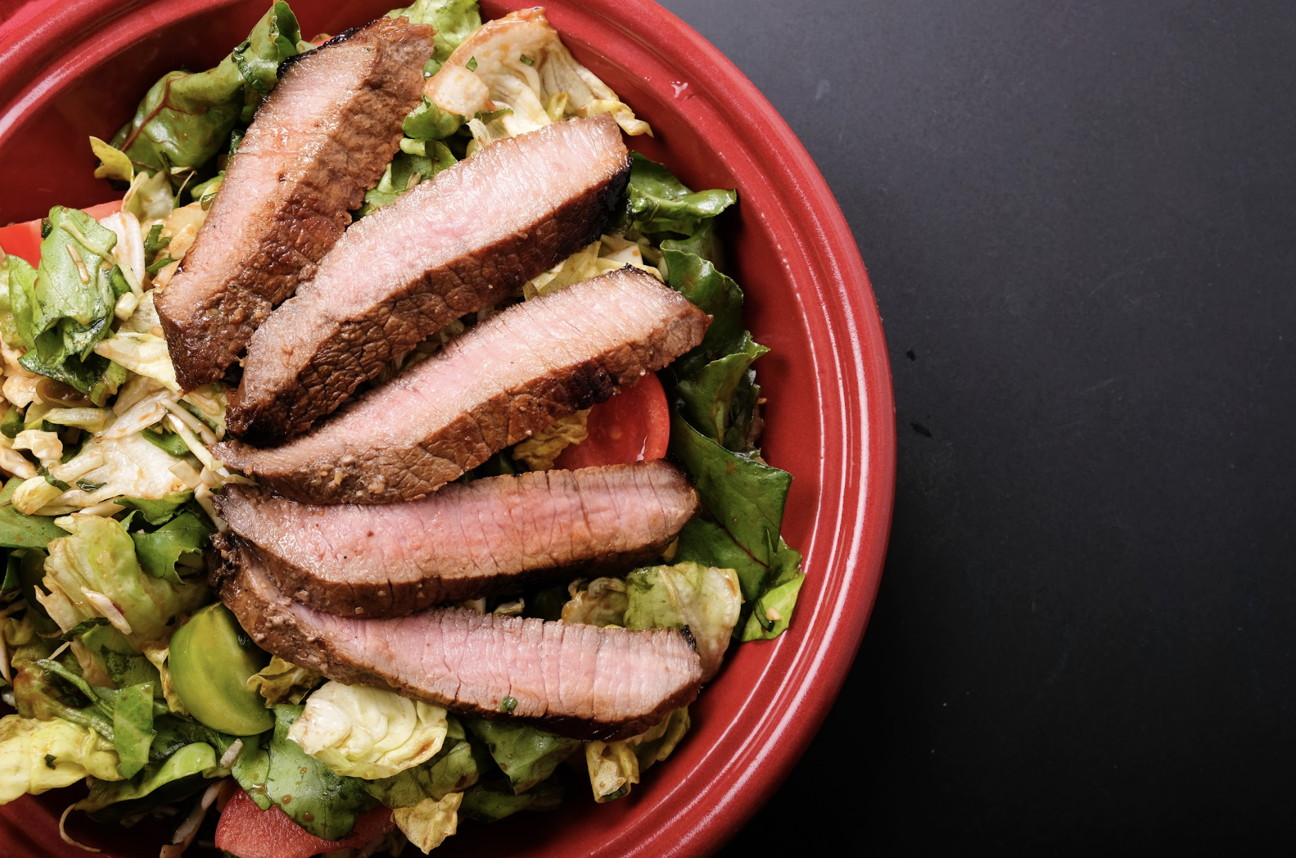 This hearty salad layers grilled STK-seasoned flank steak over crisp romaine, with juicy tomatoes, green onions, crispy bacon, and parmesan toasts. It’s finished with Freddy Dressing—a creamy, herb-packed blend with roasted garlic and a touch of cayenne—for bold flavor in every bite. Perfect for gatherings or a satisfying solo meal.