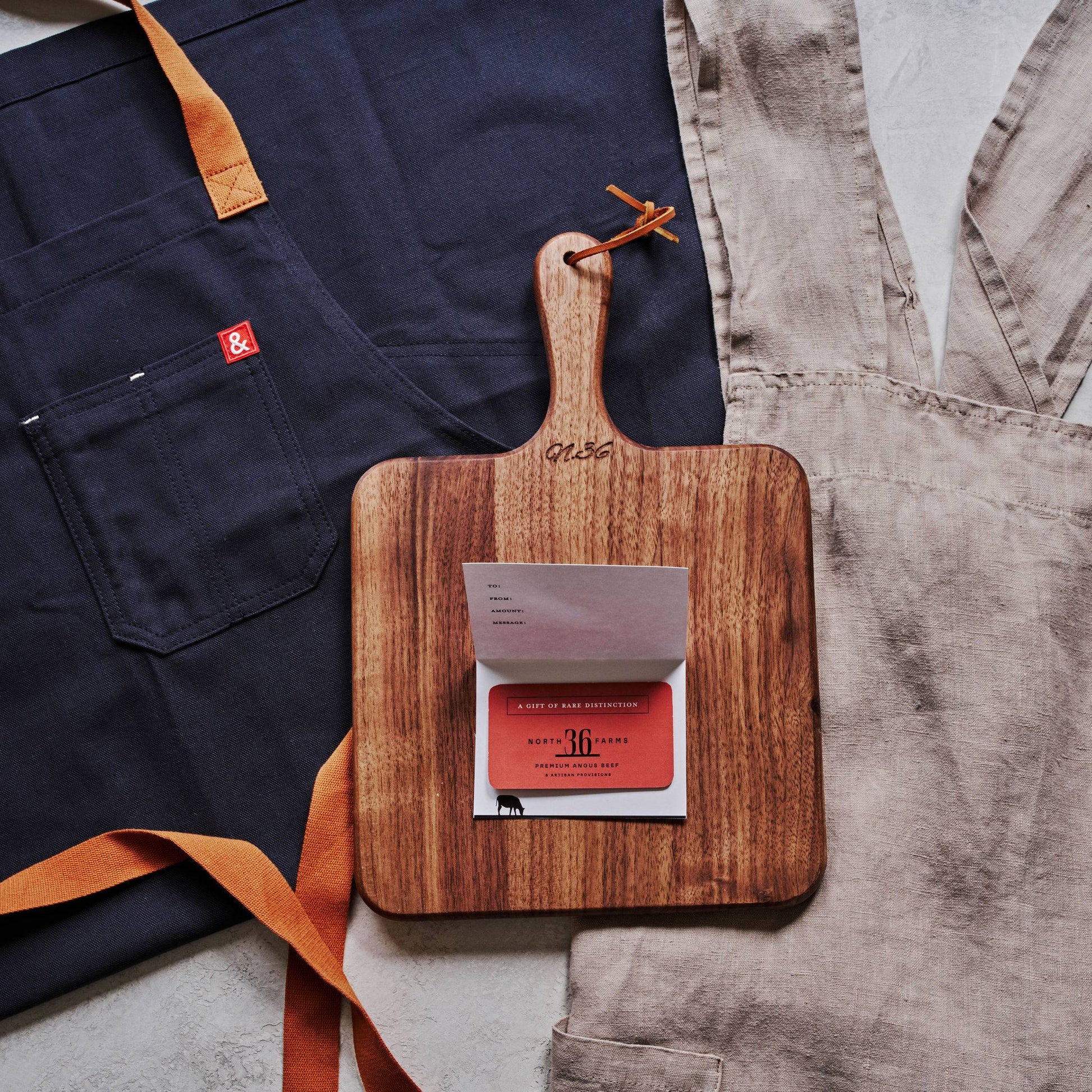 Gift Card + Hedley & Bennett Apron + Linen Criss-Cross Back Apron + Charcuterie Board. For the couple who shares the good stuff.