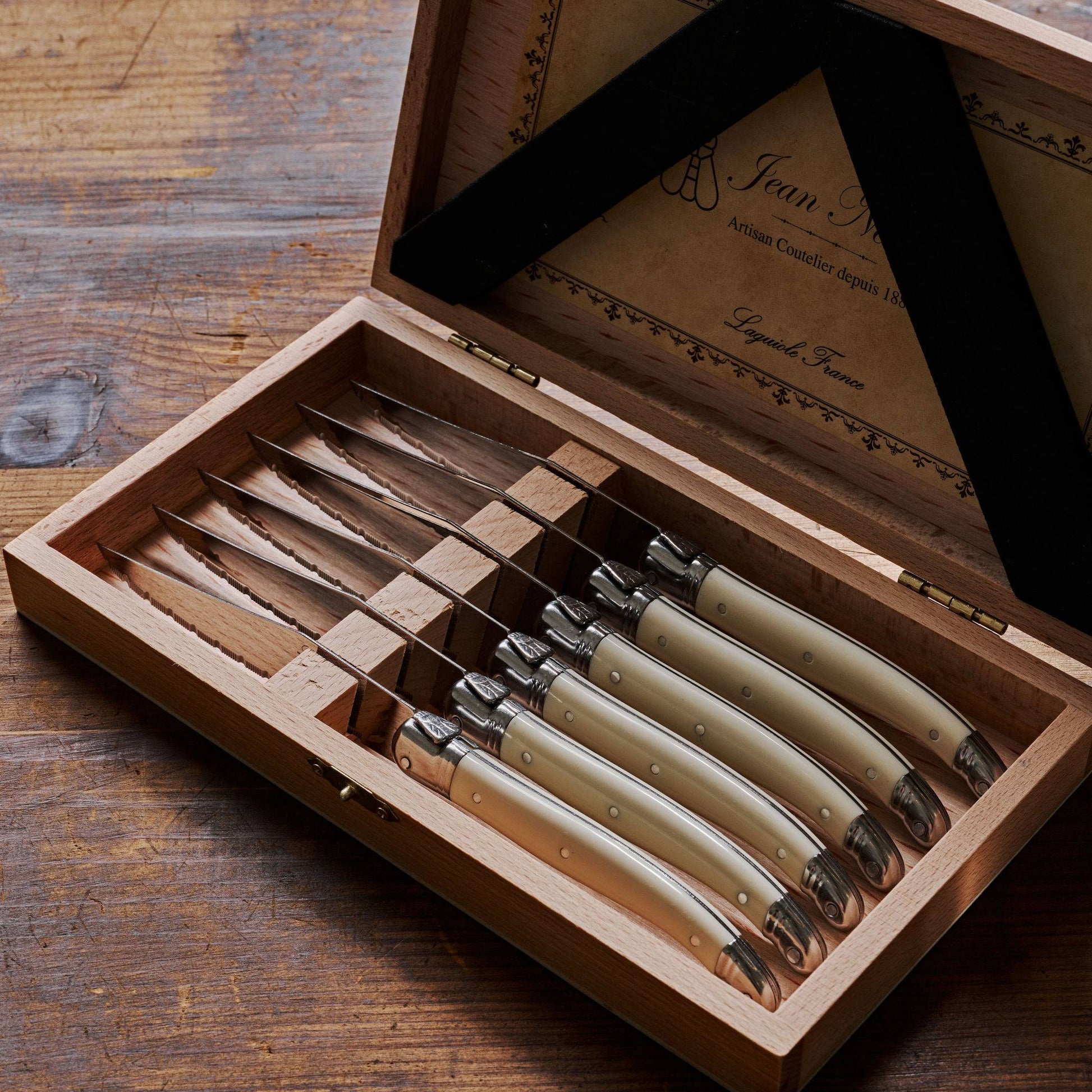A polished set of six steak knives made in the French village of Languiole, where knives are carved, assembled, and hand shaped by master knifesmiths using techniques dating back to 1828. Comes in a wooden box for storage or gifting.