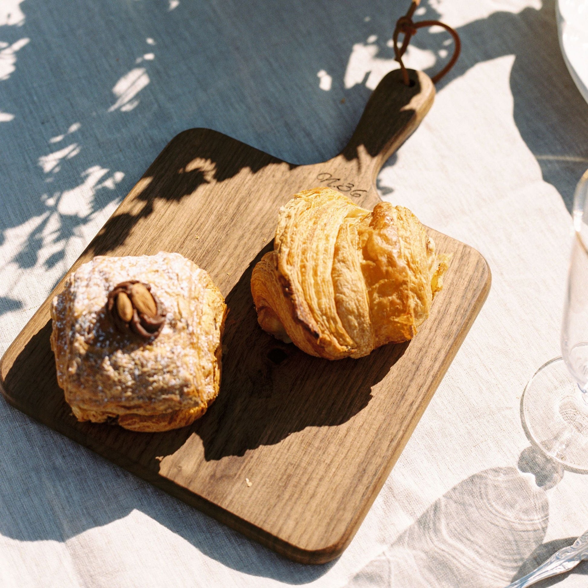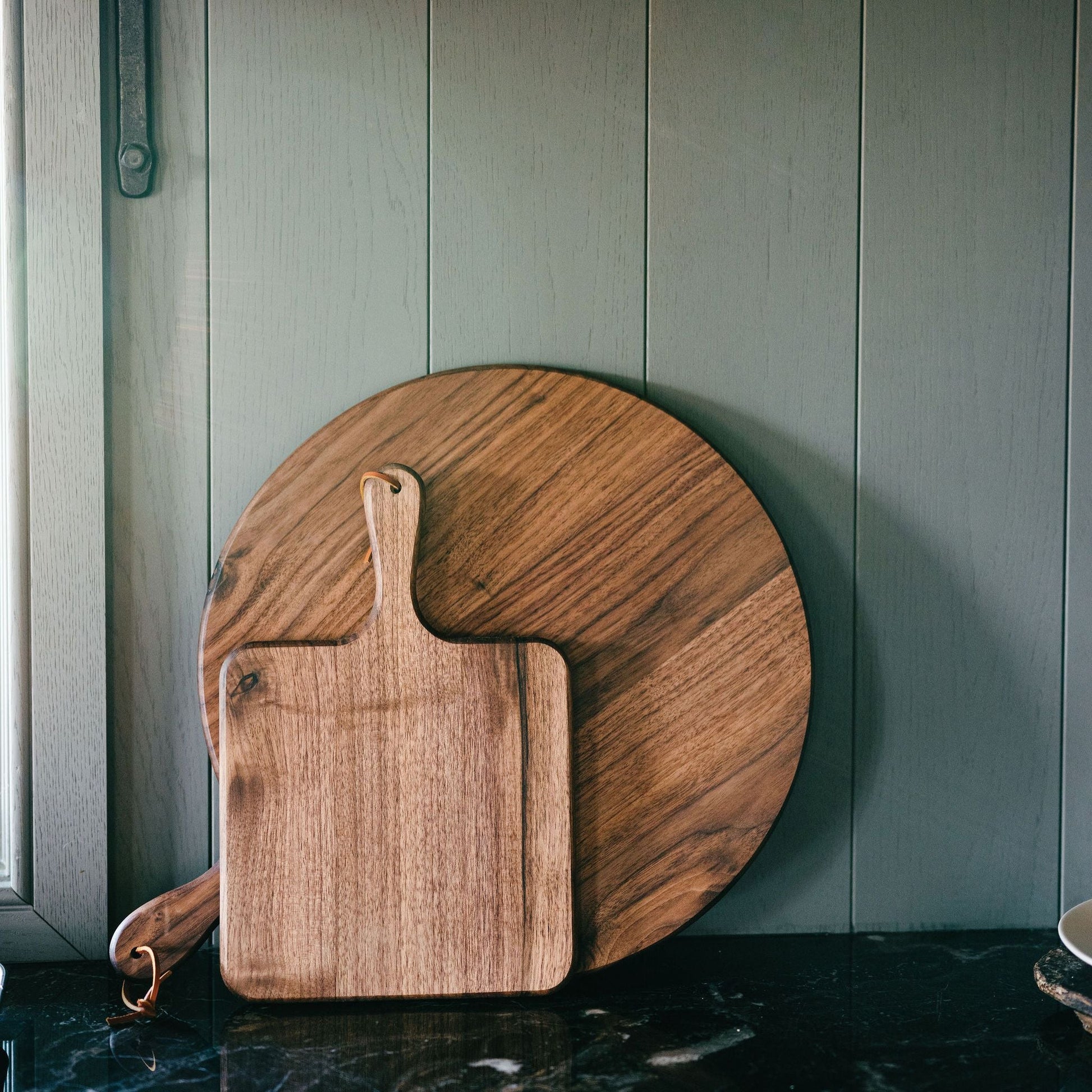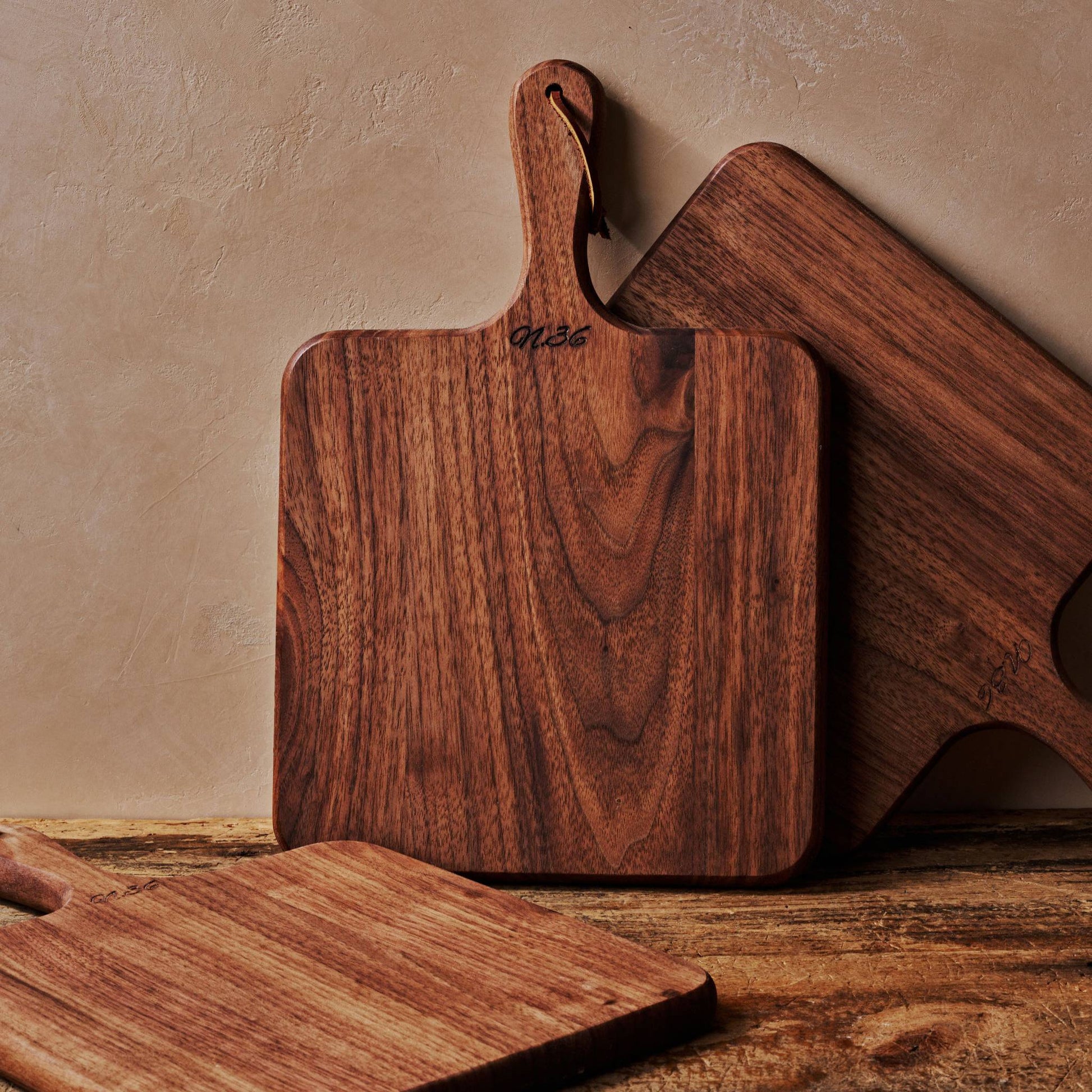 A sturdy, handcrafted paddle board in rich black walnut. Use it for cheeses, snacks, or everyday prep. It's a quietly beautiful truly functional serving piece for any kitchen.